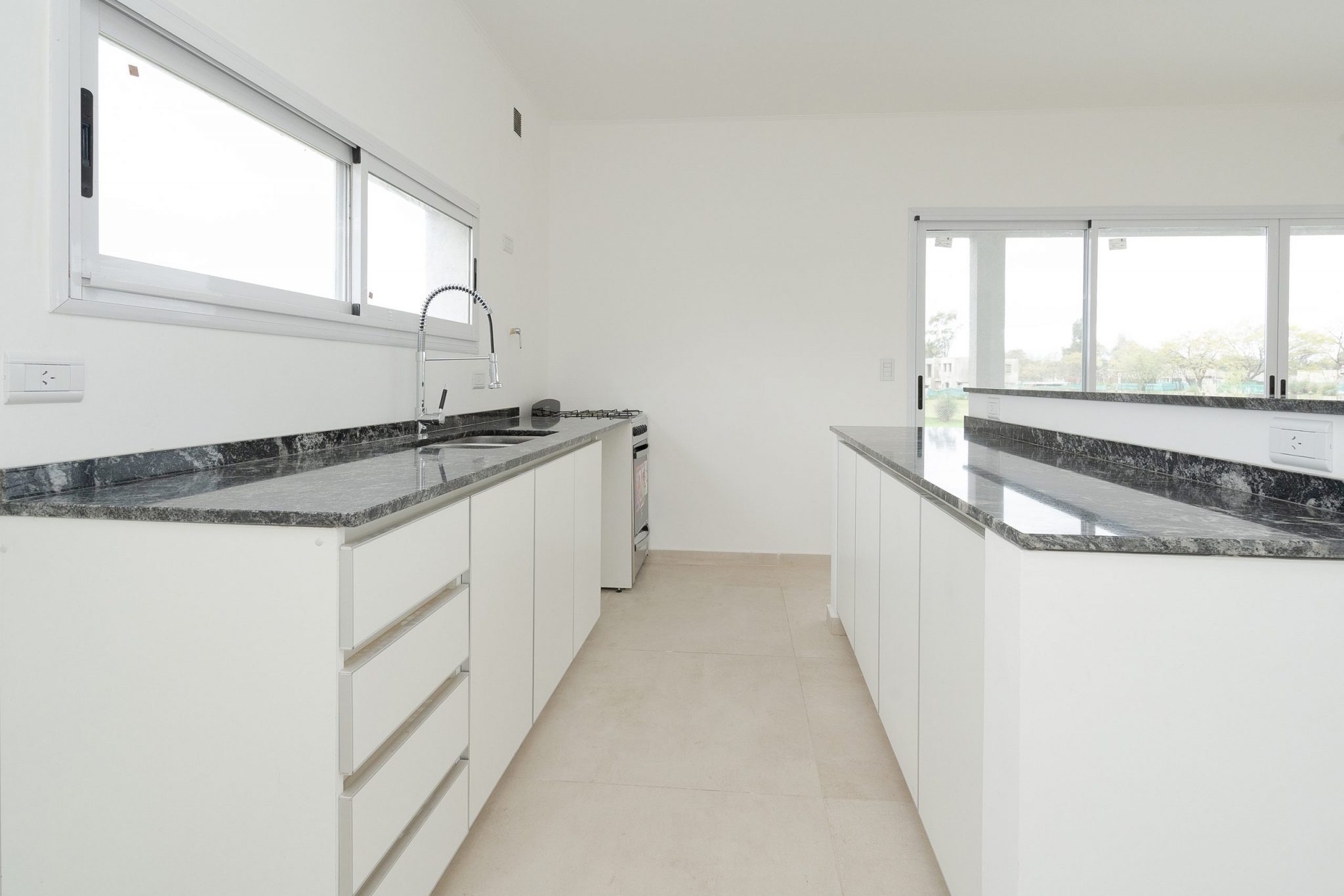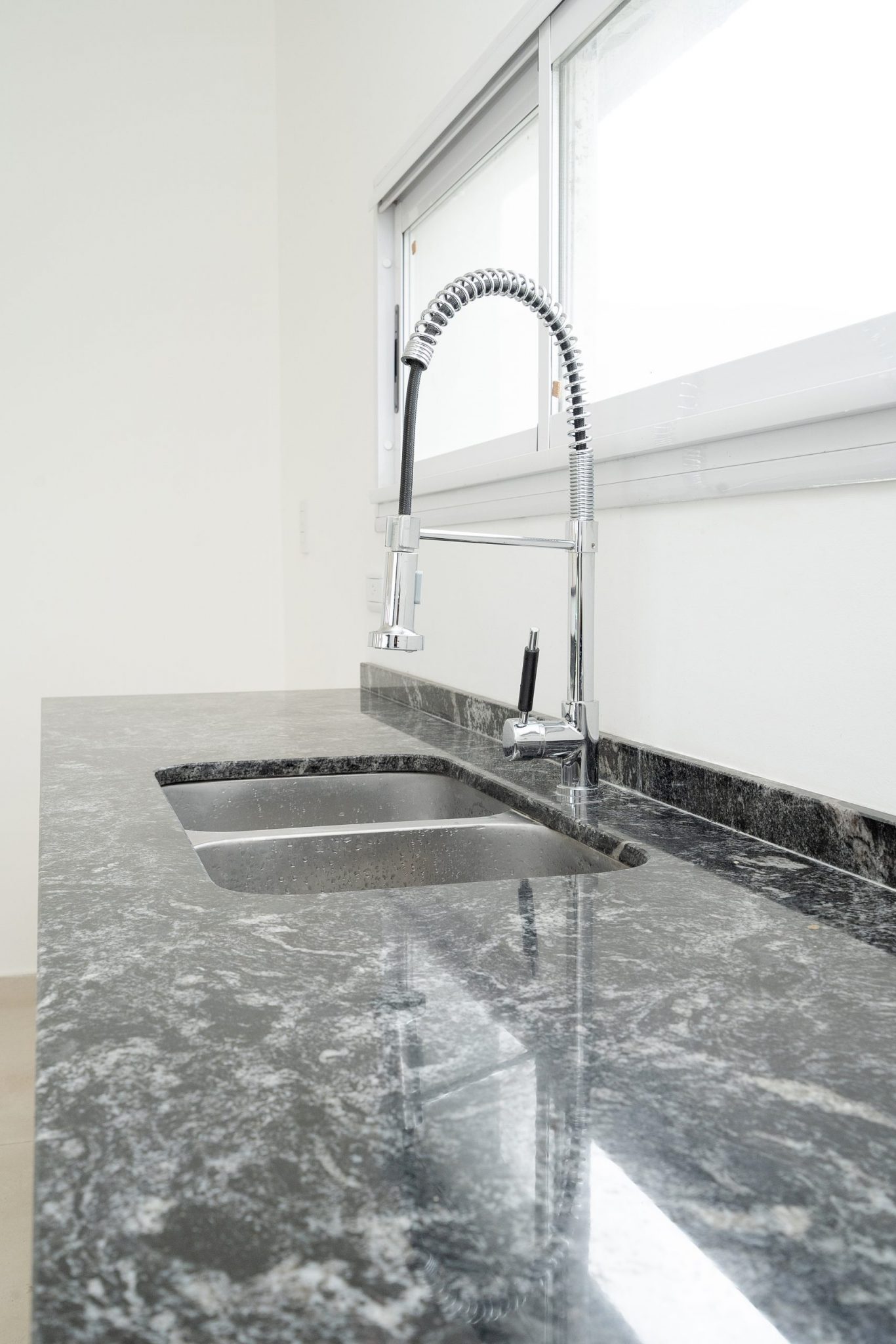 – mesada de cocina en mármol negro boreal (Se puede cambiar por un simil silestone, pagando un adicional) . Sector lavadero y parrilla mesada mármol gris mara.