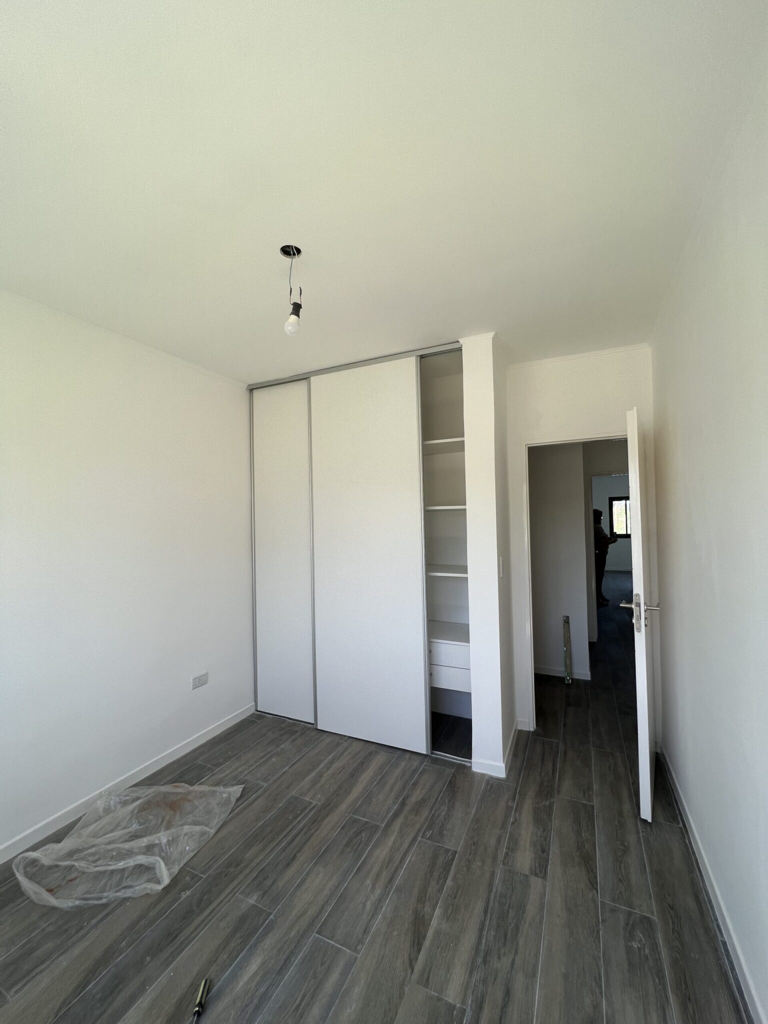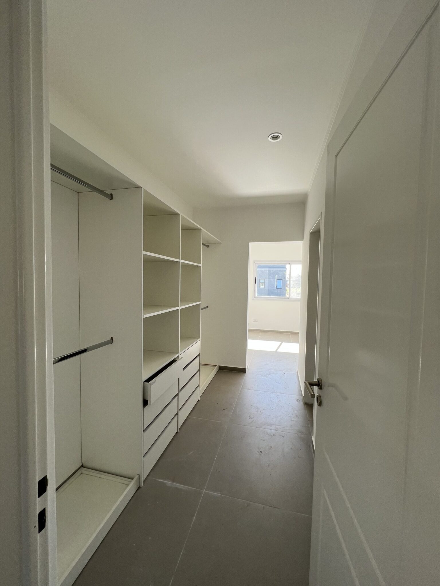 – interiores de placards en habitaciones secundarias en placa melamina blanca (Diseño en T con estantes y 2 cajones, fondo de mampostería), con sus frentes de puertas corredizas, e interior de vestidor de habitación en suite, igual diseño.
